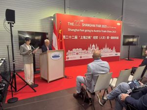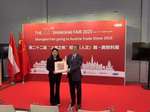 *Hongge Zhang bei der offiziellen Geschenkübergabe während der 22. Shanghai Fair 2025 in Wien.*